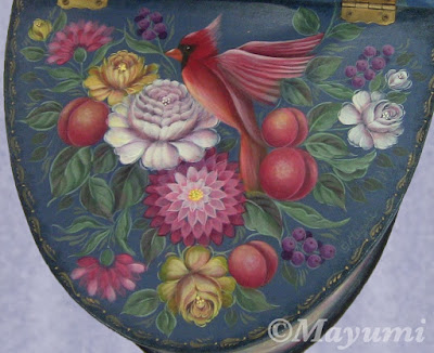 赤いカーディナルズ、美しい花と果物が描かれて豪華です。ロシアのペインティングは日本人の色彩感に比べて少し鮮やかです。ですからこのスタイルを伝統的に描くには心持ち鮮やかにすることが必要になります。このような鮮やかな色彩は日本の家屋で難しければ、少しトーンを落とせばよいでしょう。